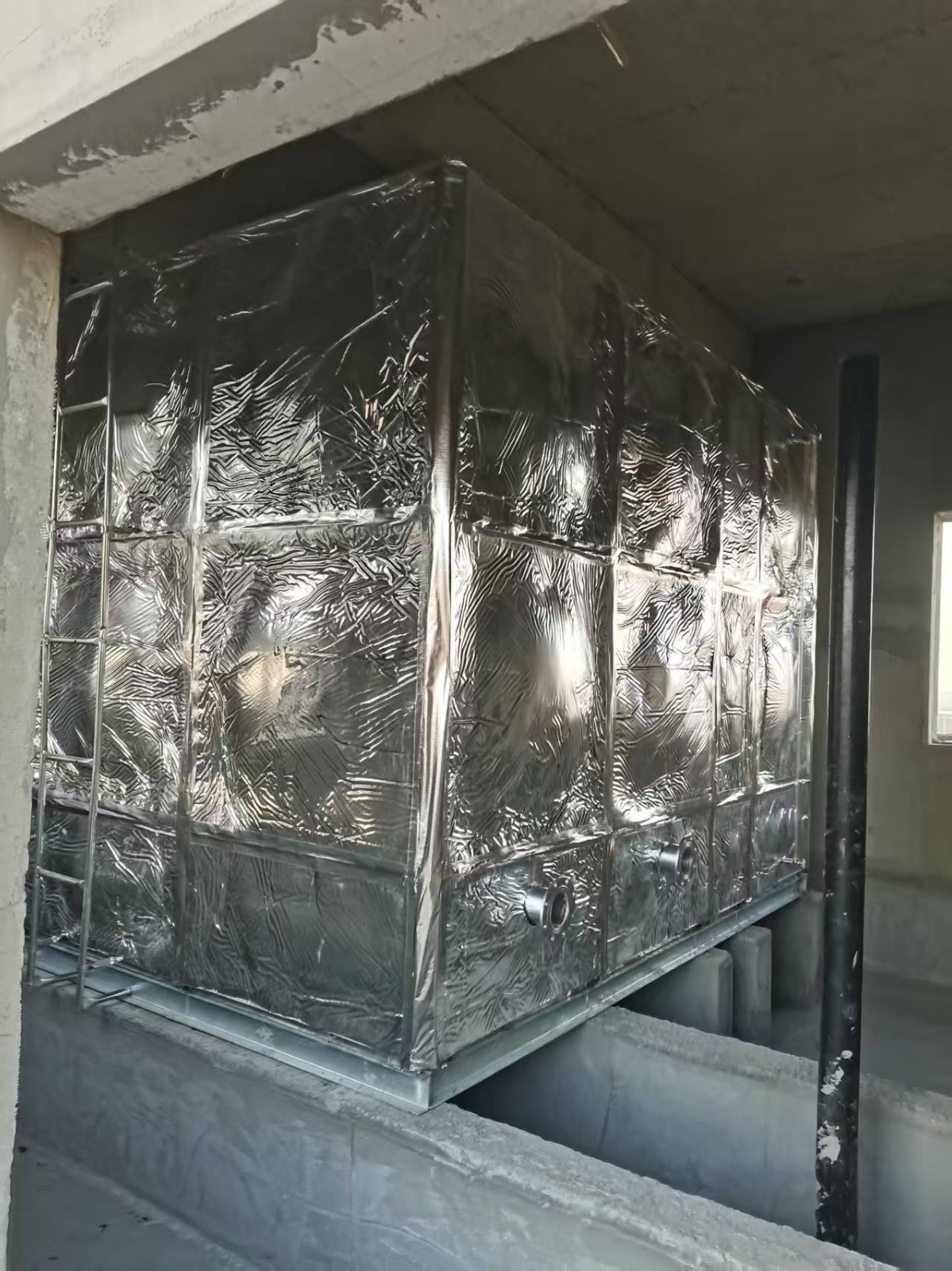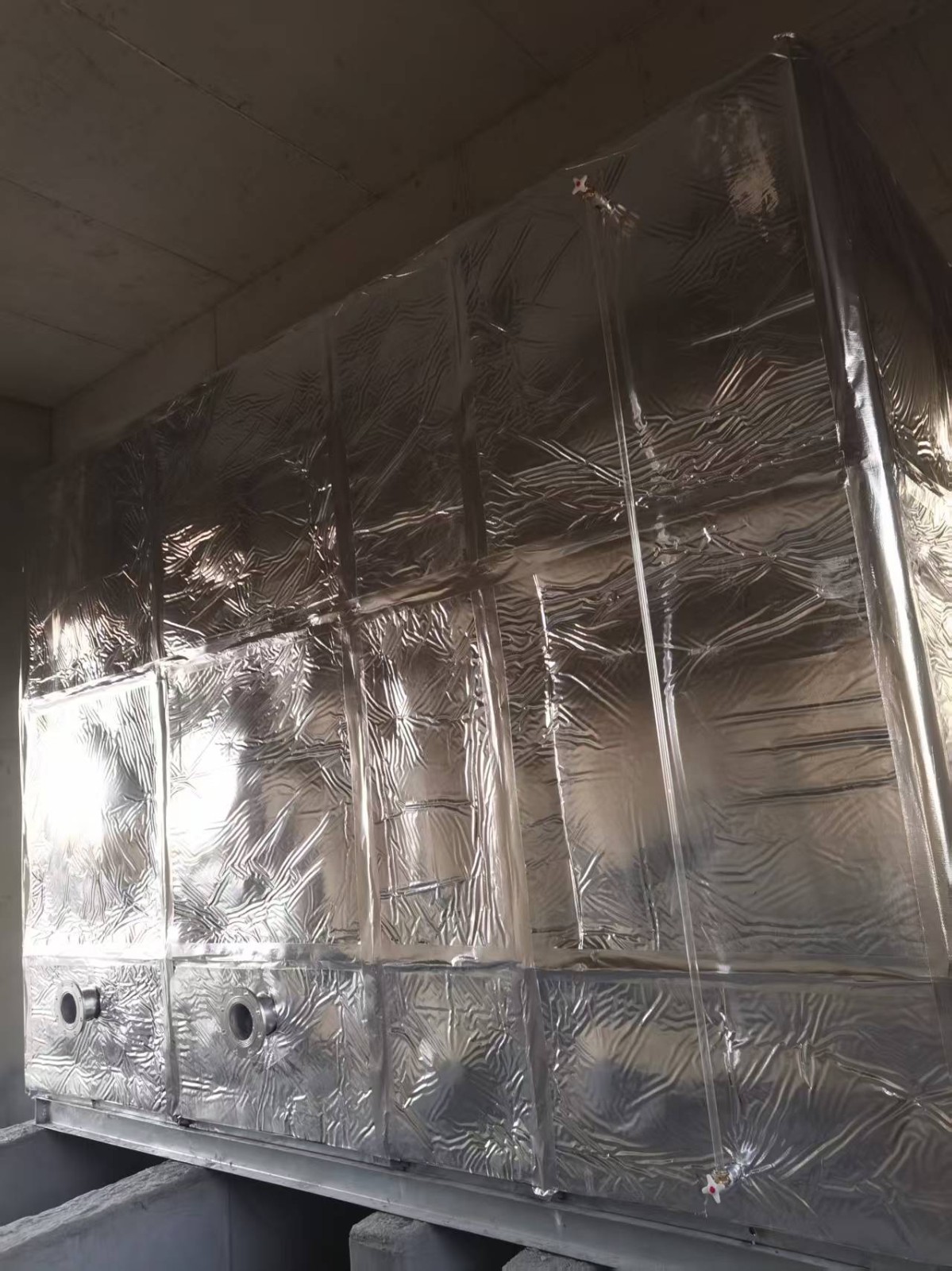 此水箱外表做了橡塑鋁箔布保溫層,鋁箔橡塑保溫材料為閉泡式結構,且表面平整光滑,所以外界空氣中的水汽很難滲透到材料之中,保冷保溫不必再添加隔汽層,從而獲得較佳的導熱系數,它的陰濕因子大于4.5×103,使它的整體既是保溫層又是防潮層。因此適用于多種防火要求較高的場所使用。