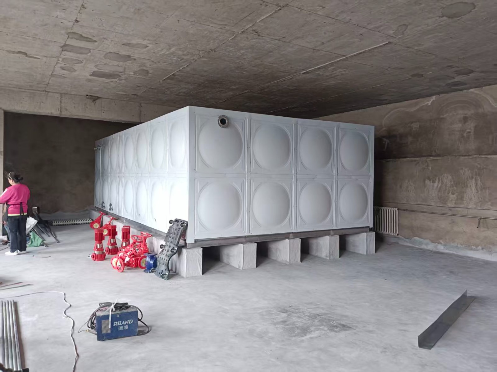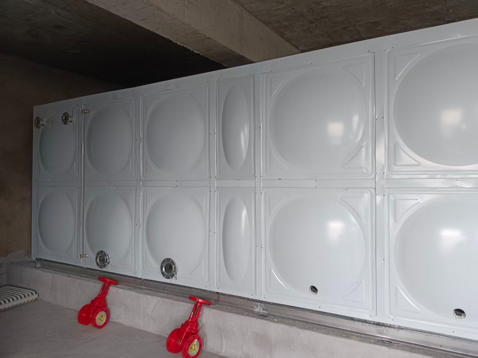 騰翔裝配式鍍鋅鋼板水箱采用Q235鋼板,沖壓形成1000×1000和1000×500的標準塊,周邊鉆孔,經鍍鋅處理,現場進行組裝,組裝時標準塊之間硅膠密封,螺栓連接。鍍鋅水箱封閉性好,不易滋生藻類。既了水箱較大限度的承壓需要,又節省了材料,滿足了水箱美觀、實用的要求。具有輕質高強、無滲漏、無變形、無污染、無霉變,使用壽命長等優點,并且結構簡單、外形美觀、安裝方便,是消防生活項目的不二之選。